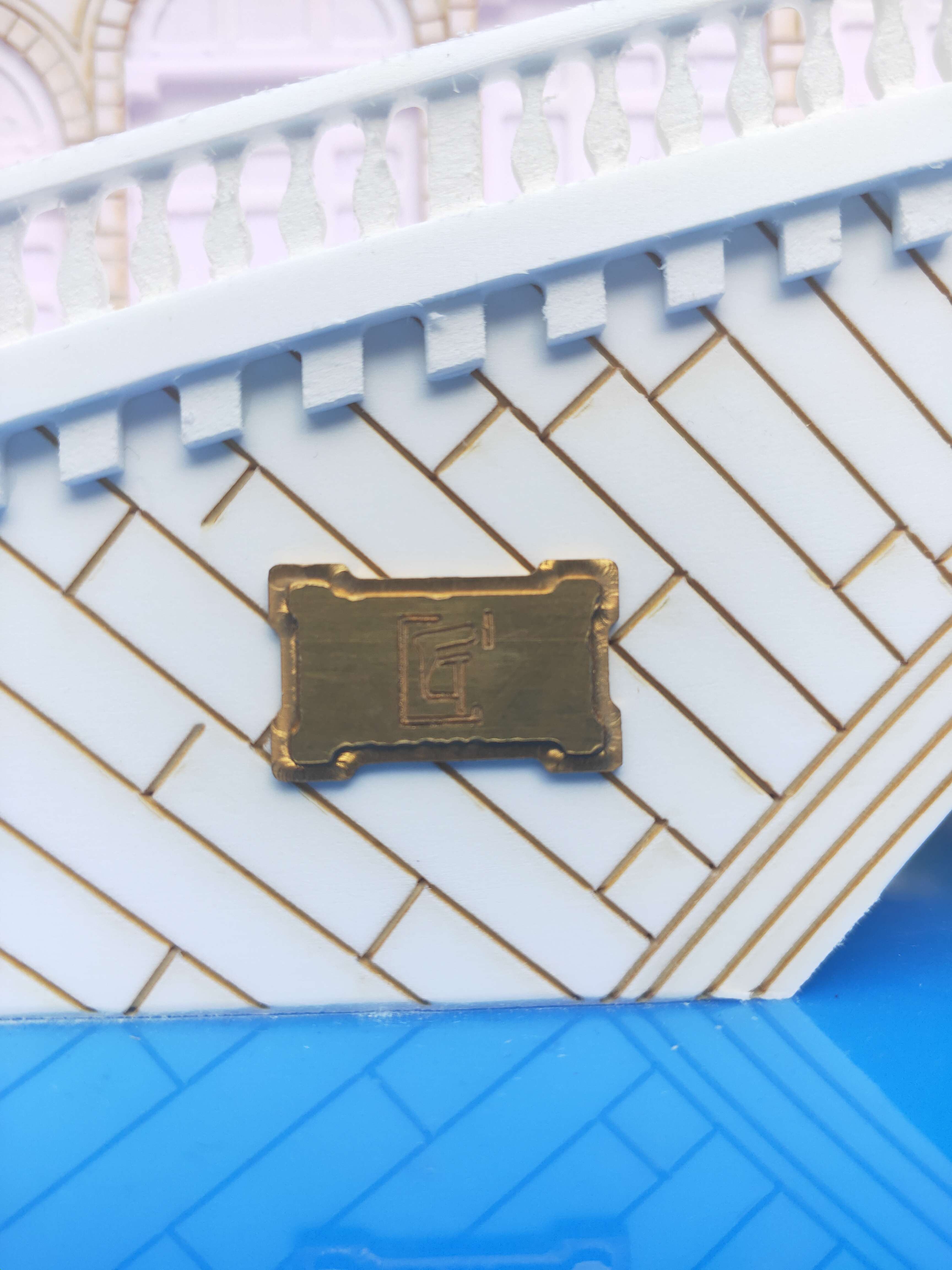 使用数控铣削功能加工铜质logo,细节处细腻的处理与金属质感为整体的设计更添 一份厚重的质感. 数控铣削与激光切割进行组合加工的技术贯穿整个设计模式。在雪弗板上使用激光 切割功能制作细致的装饰,使整体的外观设计更加生动、细腻、层次感更加分明。